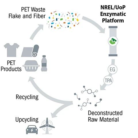 Vedci z NREL University a UoP vyvinuli nákladovo efektívnu, ekologickú enzymatickú platformu, ktorá dokáže rýchlo rozložiť post-spotrebiteľský PET na identické chemické stavebné bloky, kyselinu tereftalovú (TPA) a etylénglykol (EG).