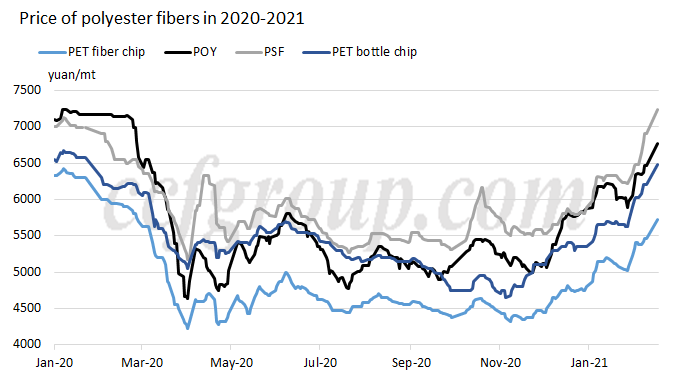 Spoločnosti s polyesterovými vláknami využívajú diskurzívnu silu na trhové ponuky, keď nie je zaťaženie zásob vysoké, náklady na suroviny sú na vzostupe, spätné získavanie je plynulé a očakáva sa, že v prvej polovici roku 2021 sa zvýši kapacita. krátkodobé, pretože polyesterové spoločnosti chcú zvýšiť cenu. Očakáva sa, že ceny polyesterových vlákien, podporované nákladmi, sa vrátia na úroveň pred pandémiou. Cena PSF už dosiahla úroveň pred pandémiou.